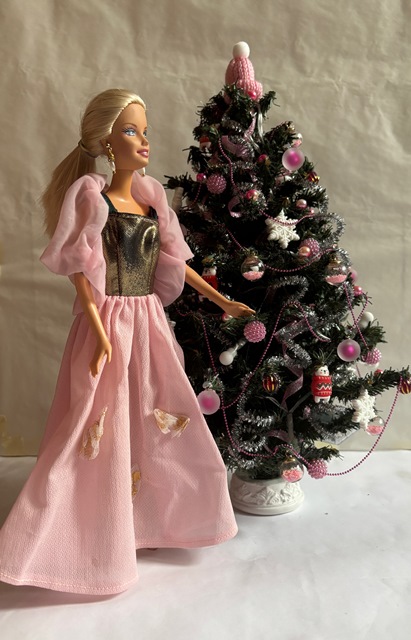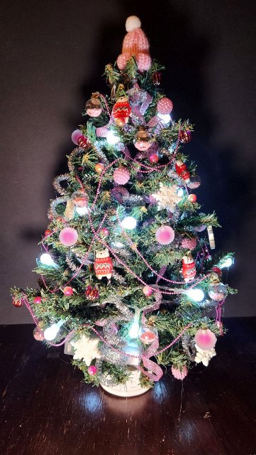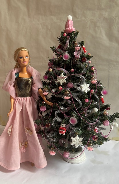 Ель декорирована разнообразными украшениями. Весь декор выдержан в масштабе 1:6 Игрушки стационарно закреплены на ветках. Макушка ели украшена забавной вязаной шапкой, которую Вы можете при желании заменить на любой другой топпер.