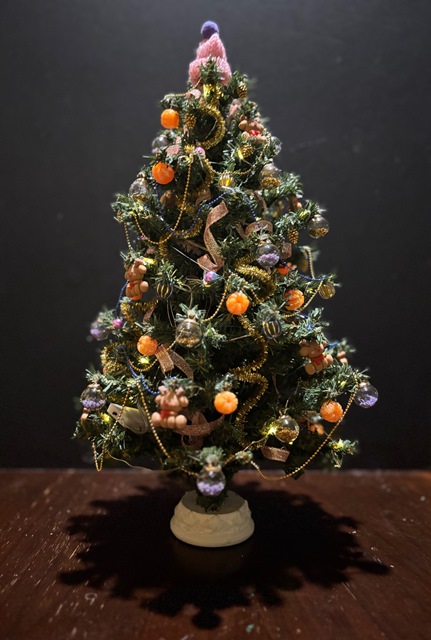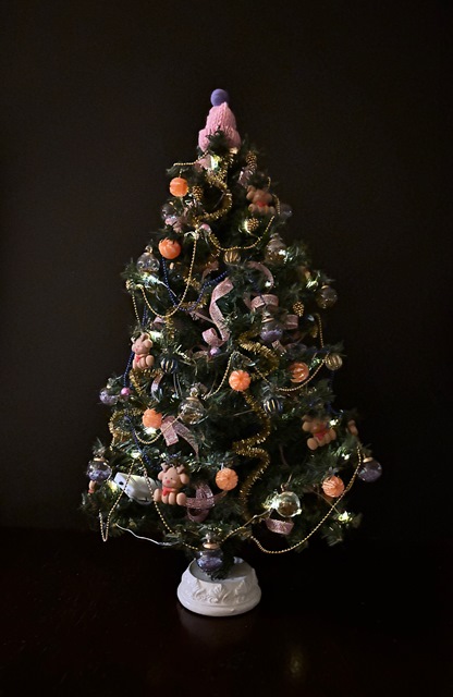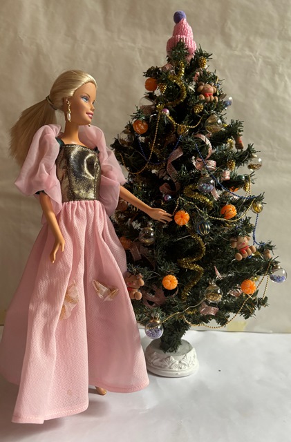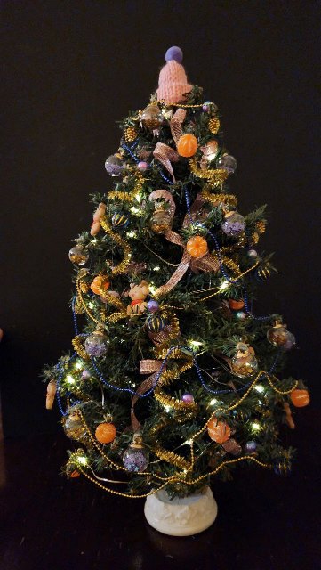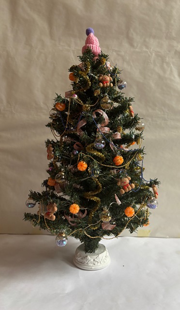 Весь декор выдержан в масштабе 1:6 Игрушки стационарно закреплены на ветках. Макушка ели украшена забавной вязаной шапкой, которую Вы можете при желании заменить на любой другой топпер.